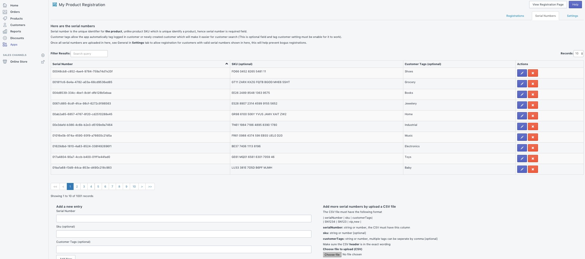 There are actions available for each serial number entry, its possible to update serial number, SKU and customer tags and delete the entry.