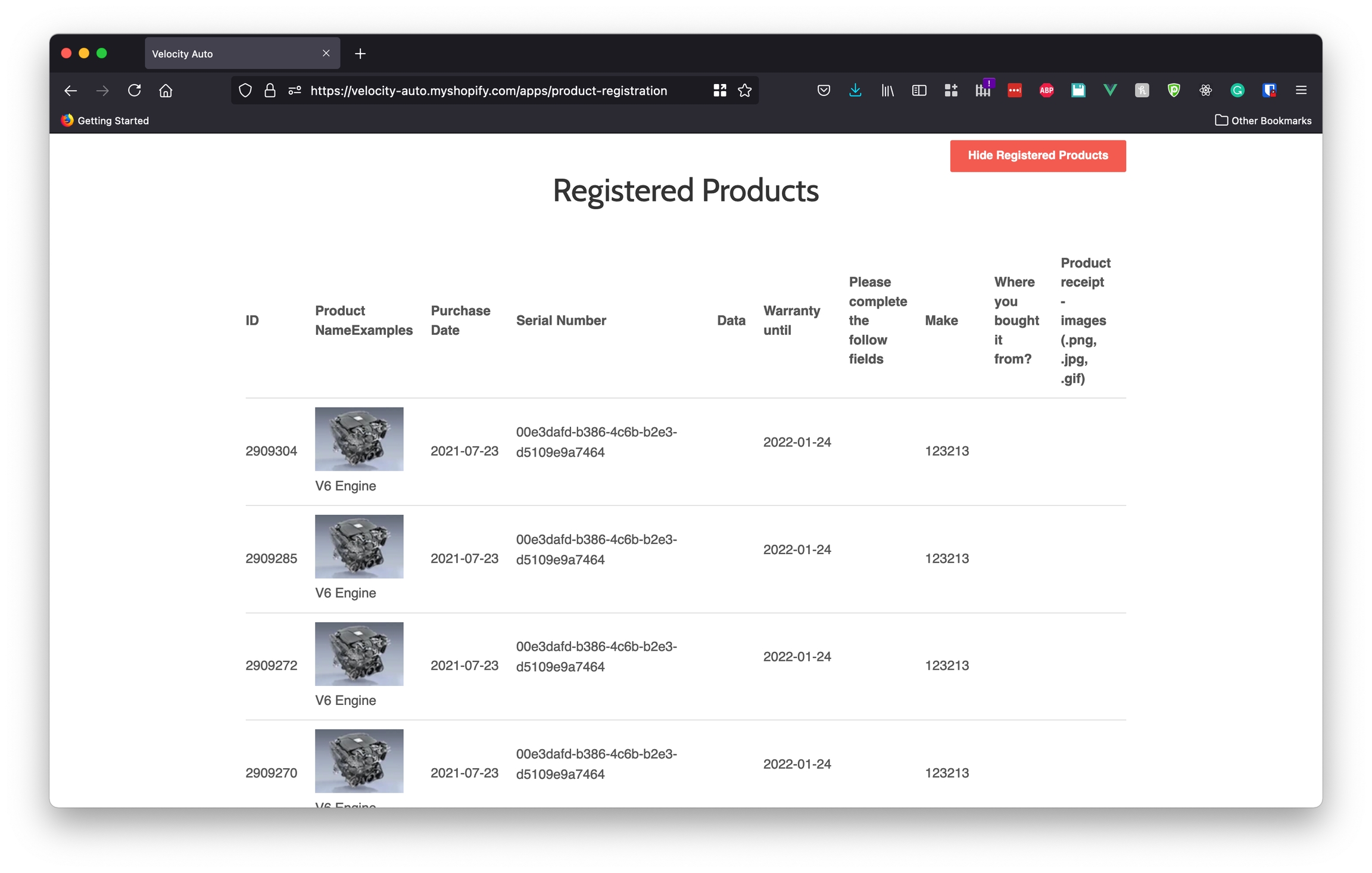 After the the setting is enabled, the customer can see the warranty information in the frontend - Registered Products
