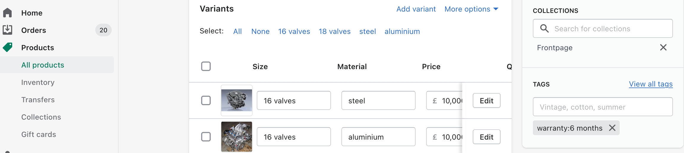 Open the Shopify admin > Products > Product and add new tags to the product to indicate the warranty period