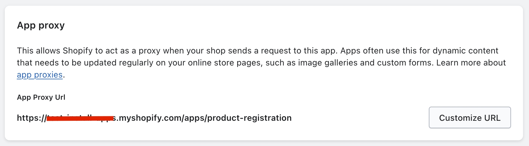 The app proxy is shown in the Shopify admin > Apps > My Product Registration > ... (top right) > App Proxy