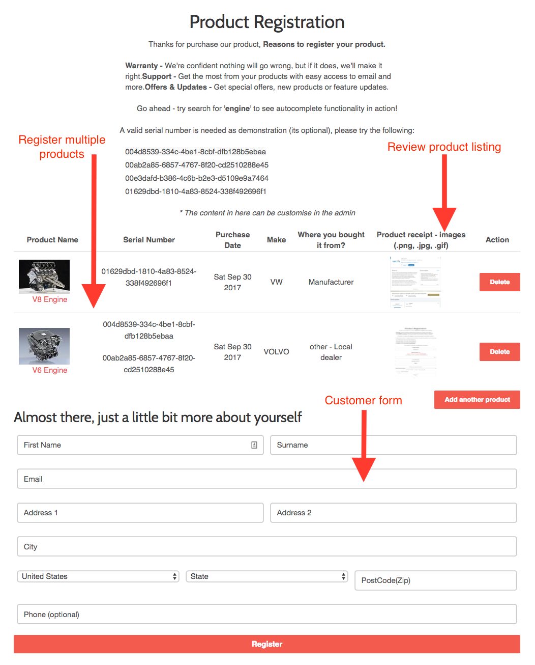 By default the form allow register multiple products, it allow customer to register multiple products in one go, it list all products customer entered, so there is a clear visibility of what will be register. (depend on the form setting, if its one step form, it will only allow to register one product at one time)