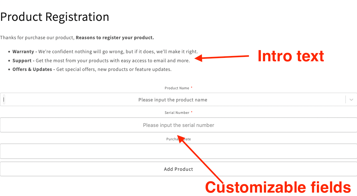 This is the page customer see when they go to Frontend page (the page is automatically created after the app is installed, its should be in the following address /apps/product-registration, note: it will be in different address if the app proxy is changed manually - don't worry about it if it doesn't mean anything).