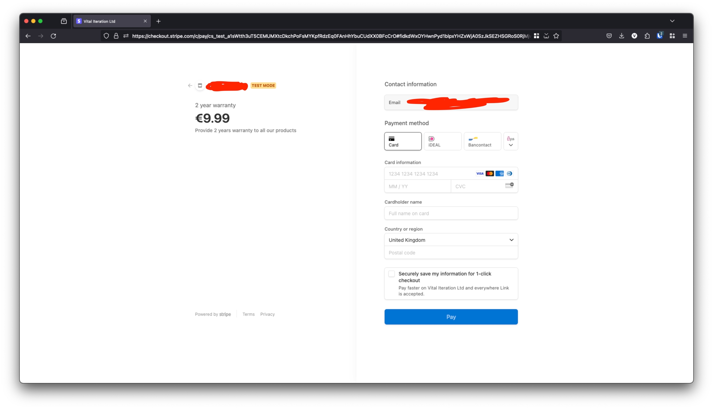 Integration with Stripe checkout (Stripe-hosted checkout page) to allow customers to pay after product registrations/claims