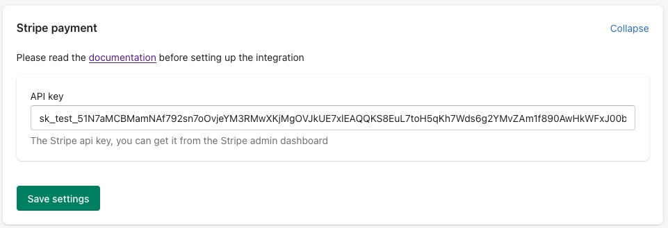 Once the Stripe API key is obtained, it need to put in the App admin > App Settings > Integration > Stripe payment
